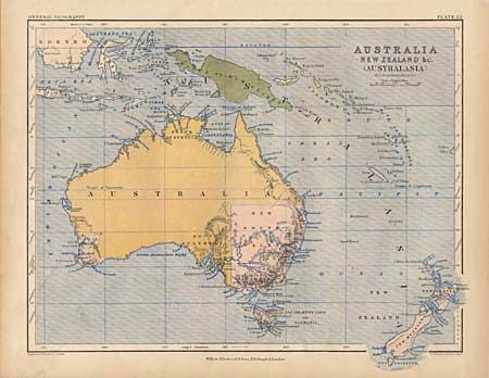 Very early color lithograph covering from Borneo through New Zealand with the majority of Australia totally blank. New South Wales and West Australia are the only regions defined. An interesting feature of the map is that the latitude bars are marked with the names of different points around the world to help the reader place the region in perspective.
