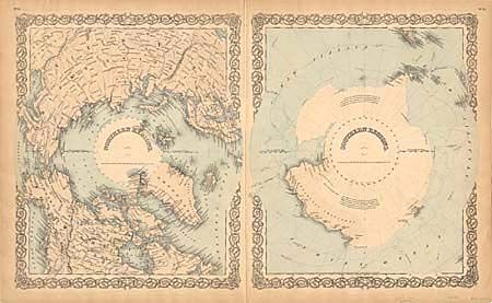 Attractive pair of maps on a double sheet. Hand colored in the oceans only. Nicely detailed with notations of 19th century discoveries. Each surrounded in the distinctive Colton scroll border. From a later edition of this atlas published in 1881.