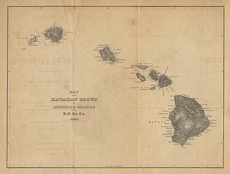 A large scale scientific investigation of the Hawaiian Islands began with the visit of naval commander Chares Wilkes in 1840-41. This map is a marked improvement over previous maps of Hawaii. The coast lines of Maui and Oahu are more accurate (despite a few flaws) and Wilkes managed to convey a vivid image of the mountainous terrain.