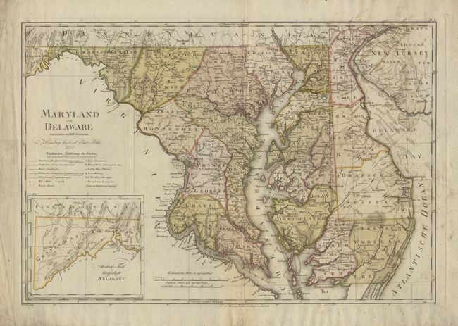 This was one of the ten maps completed by Sotzman for Christoph Ebeling's planned atlas of the United States, which was published by Carl Ernst Bohn. These were among the best available maps at the time in terms of scale and level of detail. It provides incredible detail including the location of mills, churches, taverns and even the names of individual land owners. The newly created District of Columbia is shown with its original boundaries. The western part of Maryland is included in a large inset. Ristow notes that these maps "are among the rarest of cartographic Americana for the closing decade of the eighteenth century".