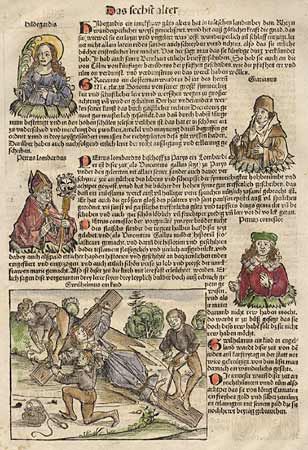 Fine leaf from one of the most important early world histories. The full sheet of German text contains several portraits of important people in full original color. Also features a large illustration of three men tying a man to a cross.