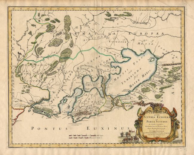 Handsome map of the region north of the Black Sea. It is finely engraved to show mountains, forests and cities. The strapwork title cartouche includes a small vignette featuring soldiers with their fine horses, for which the region was renowned.
