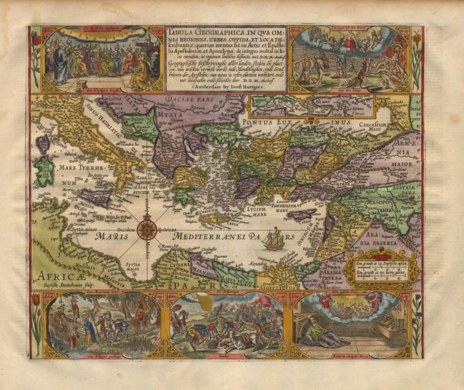Finely engraved map of the region discussed in Acts and Revelations. The map is enclosed top and bottom with five biblical vignettes including the apostles receiving heavenly inspiration and the apocalypse. The map includes an inset of the entire Mediterranean and is decorated with a compass rose, sailing ship and strapwork distance scale.