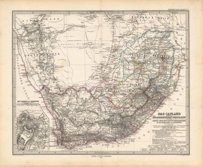 Very detailed map showing all of South Africa, extending north to Damara Land in the west and Matebelle Reich in the east. Nicely rendered and finely engraved inset of the Cape Town area. Keyboard style border.