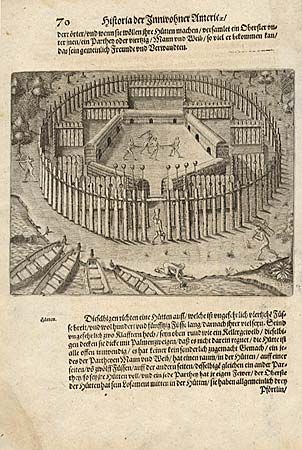 Illustration of a Tuppin Imbas' village. It is constructed in a circle of large poles, onto which the skulls of their enemies are mounted. Fences and lodges fill the interior and enclose the central plaza. The people are shown going about their daily chores and in the plaza is a scene depicting the capture of Hans Staden.