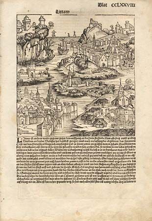 Very large view (9 x 9") with German text below. This is a fanciful view of the Lithuanian landscape filled with castles, villages, churches and boats. Verso includes a smaller view (8.7 x5.5") of a medieval walled city.