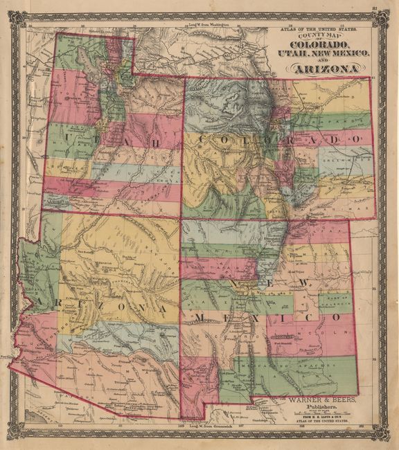 Very attractive map of the four corner states from this somewhat scarce atlas. Early county development, good detail of railroads, forts and emerging cities. Arizona features the newly formed Maricopa County. Terrific detail throughout. Decorative border and handsome Victorian-style titling.