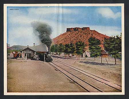 Consisting of 23 printed-color views plus one on the cover of a steam locomotive and cars in a Colorado canyon. Available only enroute on The Denver & Rio Grande Western Railroad. Vintage scenes include Pike's Peak, Castle Rock, Colorado Springs street scene, double page of the Rockies, Leadville, Glenwood Springs, and a dramatic locomotive scene in Animas Canyon. There are 26 photos rather than the 23 called for. The extras are similar in subject and may have been added by a previous owner.
