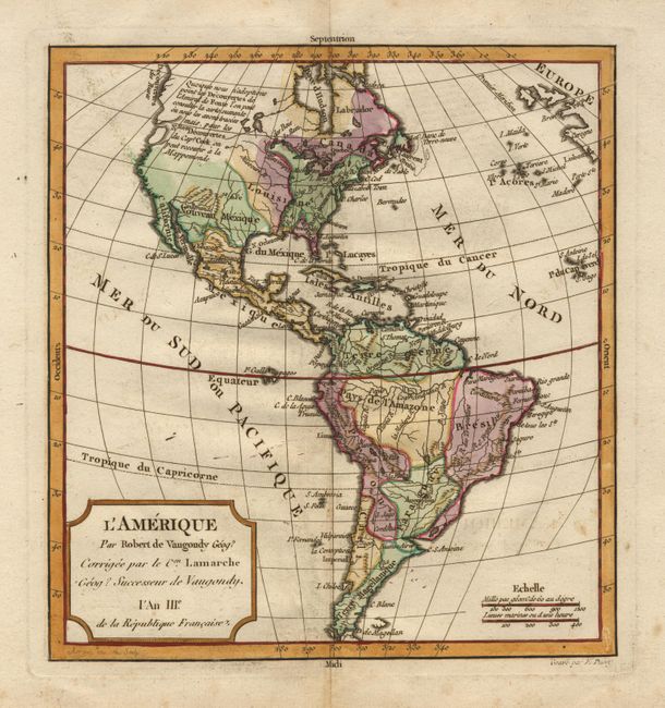 Based on Robert de Vaugondy's map of the same title (1762) and updated to include Capt. Cook's new discoveries in the Pacific Northwest, with a large notation (French text) and a hint of a possible Northwest Passage. Engraved by E. Dussy.