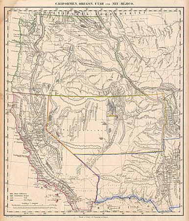 Handsome German map depicting the state of California and the large western territories of Oregon, Utah and New Mexico. The border with Mexico is on the Gila River. Salt Lake City is also named New Jerusalem. Filled with Indian names, a few forts and not much else.