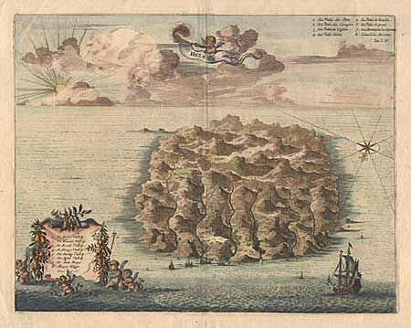 A well rendered birds-eye view of the island with numerous sailing ships, decorative cartouche with putti, sunset and towering clouds on the horizon. Compass rose and rhumb lines appear to be placed on the ocean surface in 3-D perspective.