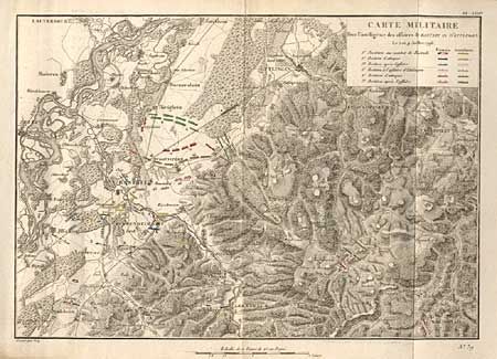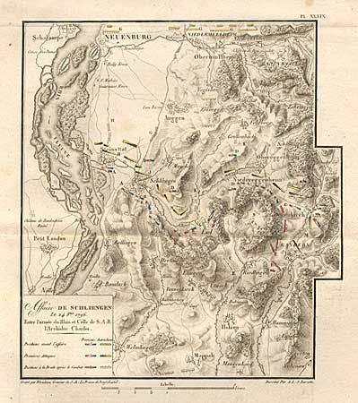 Finely engraved battle plans with minute detail of the surrounding countryside, fortifications and troop placements. Lot includes: "Affaire de Schliengen Le 24 8.bre 1796. Entre l'armee du Rhin et Celle de S.A.R. l' Archiduc Charles", 7.6 x 9.2" with troop placements in color; "Carte Militaire Pour l' intelligence des affaires de Rastadt et d' Ettlingen Le 5 et 9 Juillet 1796", 14.3 x 10", with troop placements in color; "Plan de la Bataille de Jagerndorf en Prusse livree le 30. Aoust 1757 entre les Russes & les Prussiens", 14.5 x 8.3"; "Bataille de Cunersdorf and Bataille de Minden", two plans on one sheet, overall 13 x 8".