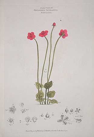 Large folio album with 50 beautifully engraved plates of various plants and flowers and 53 pages of genus data on each plate. Only one of the plates has hand coloring, which is very well done. All on fine hand-laid paper with large watermarks. Missing any pages before plate 1 so we are unsure of the exact title of the work. The text beneath each engraving reads "Painted Engrav'd & Publish'd by J. Miller; Dorset Court…" John Miller (Johannes Sebastian Mueller) was born in Nuremberg and came to England in 1744. He published several botanical books, the best known being Illustrations to the Sexual System of Linnaeus, 1776. This portfolio belonged to Andy Warhol and was sold in the Sotheby's Andy Warhol Collection auction in 1988. Warhol's book plate is on the inside front cover. Includes a copy of the receipt from the auction. A beautiful collection of botanical plates.