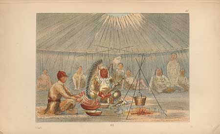 These are chromolithographs from a 1892 edition of George Catlin's The Manners, Customs and Condition of the North American Indians written during Eight Years Travel Amongst the Wildest Tribes of Indians in North America, 1832-39. Catlin was an American artist and traveler who devoted himself to using his art to illustrated the customs of the American Indian. He painted over 600 pictures of Indians and their cultural life from 48 tribes.