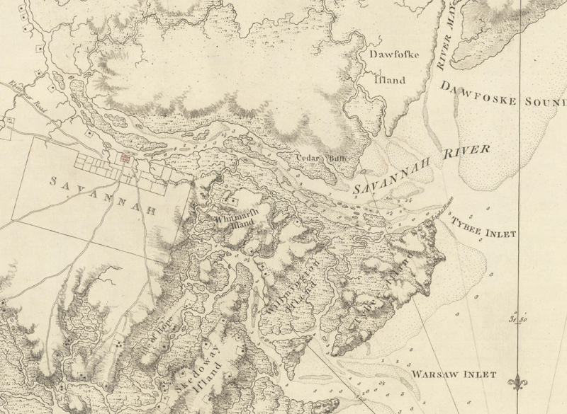 A close-up of Des Barres’ 1780 chart of the Georgia coast and city of Savannah. This was the best contemporary chart of the region. (Image courtesy of Old World Auctions.)