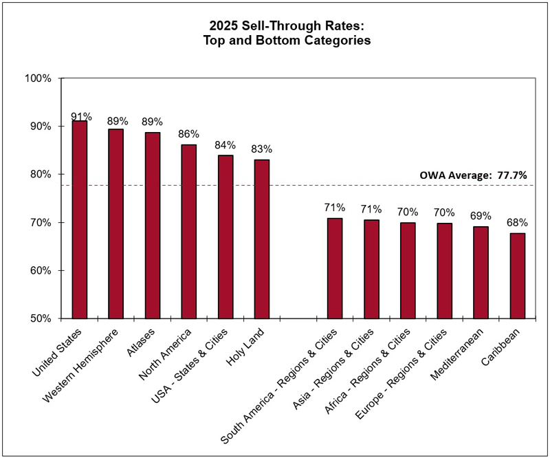 We find that most of our customers have collections based on a specific state, region or country, and we group our material accordingly into 40 categories, primarily based on geography. These categories include the world, each of the continents, regional maps within each continent, polar maps, the oceans, prints, atlases, reference books, historical documents, etc. Because our auction house is based in the United States, we typically find that maps of the western hemisphere, North America, and United States are our best-selling categories, and 2025 continued that trend. Conversely, maps of regions and cities within Europe, Africa, Asia and South America performed on the lower end this year based on sell-through rates. Interestingly, when you compare the sell-through rates for our top and bottom categories between 2024 and 2025, the sell-through rates in 2025 all shifted closer to the OWA average of 77.7%. While the bottom categories generally improved compared with 2024, the top categories declined slightly. Overall, we saw fewer wild swings in performance this year, which means that our mix of material more closely matched our customers’ interests.