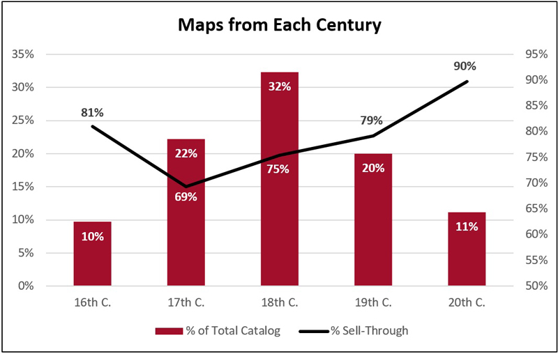 In addition to ensuring that we have a wide representation of geographic locations within our auction material, we also strive to have a good selection of maps from various time periods. The mix of maps by century remained essential unchanged from 2024 to 2025. And just like last year, 20th century maps continued to be the most popular, as more and more collectors are discovering the fascinating range of material available from the last century. At the other end of the spectrum, it is worthy to note that our sell-through rate of 16th century material increased from 73% in 2024 to 81% in 2025. In the future we will work on sourcing more of the “oldest” and “youngest” maps to meet our customers’ interests.