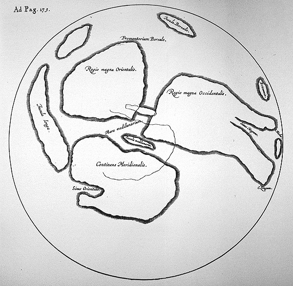 What distinguishes Gilbert’s map is that it seeks to locate and name the features of the Moon. Gilbert believed the shadows of the Moon were landforms, and labeled them accordingly with names like “Regio Magna Orientalis” and “Continens Meriodinalis.” He perceived the light areas as bodies of water, with names like “Mare Medilunaraum” and “Sinus Orientalis.” The map, which originally appeared in a manuscript copy of Gilbert’s De Mundo Nostro Sublunari Philosophia Nova (circa 1600), was not engraved and published until 1651. It is recognized as a milestone today, but because of its initial obscurity and primitive nature, its depiction of the Moon did not influence subsequent lunar cartography.