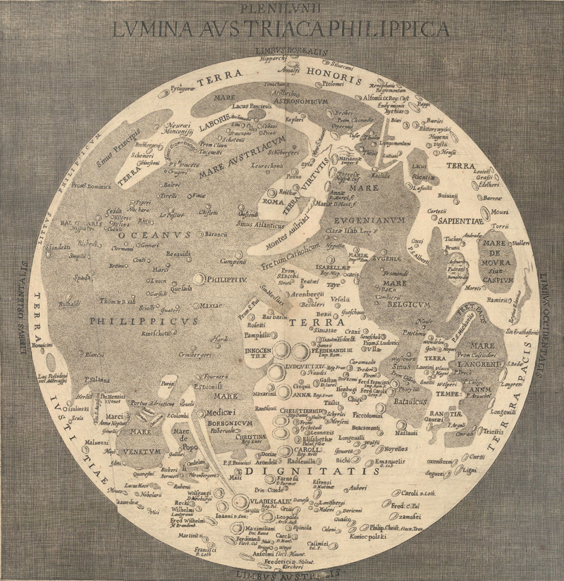 All of a sudden, the Moon had topography. And if it had topography, it could be mapped. But, as Gilbert recognized on his maiden effort in lunar cartography, maps need place names. The story of lunar nomenclature is complex and contentious, spanning centuries; the names of the Moon’s features were not formally standardized until the 1960s. The French mathematician and astronomer Pierre Gassendi was one of the first to try to devise a naming system for the Moon’s features, but his efforts, begun in 1628, were buried in his unpublished letters and journals. (His legacy is a lunar crater named after him.) Somewhat more successful was the contemporaneous project of Michiel van Langren (Langrenus), a member of a Flemish family of mapmakers who created a lunar map, Plenilunii Lumina Austriaca Philippica (1645), which was the first published map to attach proper names to specific locations on the Moon. Since Van Langren was serving as the Royal Cosmographer to King Felipe IV of Spain, his nomenclature leans heavily on royalty, the Habsburgs, notable Catholics, and other figures favored by the king. (Van Langren also could not resist naming one of the lunar maria after his own family.) Of the 325 names introduced by Van Langren, 68 are still used to this day; however, all but four were repurposed to apply to different features. Few original examples of his map survive today, but pirated editions occasionally appear on the collector’s market.