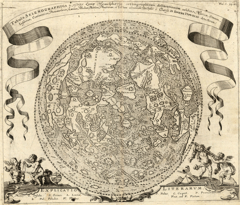Given the daunting nature of the task, it is a miracle that we have any Moon maps at all! There are many lunar maps and images that have been produced since the invention of the telescope, however most of these are copies of previous maps rather than works based on original observations. As Francis J. Manasek notes in his A Treatise on Moon Maps, in the three-century stretch between Galileo’s first published telescopic observations and the emergence of reliable, detailed lunar photography, “Fewer than twenty maps based upon original telescope observation and covering the entire lunar hemisphere were published.” We do not have sufficient space here to write about all of the original maps, but we will look at some of the key early breakthroughs in lunar cartography from the 17th, 18th, and 19th centuries, before the invention of photography. For a more comprehensive approach to the subject, we highly recommend Manasek’s A Treatise on Moon Maps: Visual Studies on Paper, 1610-1910 and Ewen A. Whitaker’s Mapping and Naming the Moon: A History of Lunar Cartography and Nomenclature.