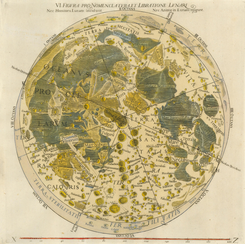 What better way to understand a distant celestial body than by comparing its features to recognizable sites on the Earth? There is a logic to Hevelius’s naming scheme, but his lengthy Latinized place names were eventually phased out by the competing nomenclature of the Italian Jesuit astronomer Giovanni Battista Riccioli. In 1651, Riccioli published Almagestum Novum, a two-volume scientific encyclopedia that included two large lunar maps made by Francesco Maria Grimaldi, based on the observations of Van Langren and Hevelius. On the second map, Grimaldi introduces Riccioli’s nomenclature. For the maria and landmasses, Riccioli favored names connected to weather conditions, like “Mare Tranquilitatis” (Sea of Tranquility) and “Mare Imbrium” (Sea of Showers or Rains). Riccioli followed Van Langren in deciding to name other features after famous people, and even appropriated 63 of Van Langren’s names. However, Riccioli’s system skirted potential political controversy by using only the names of deceased philosophers and scholars with a connection to astronomy. So Hevelius’s “Mt. Aetna” became “Copernicus” in Riccioli’s nomenclature; among the other names used by Riccioli were Tycho, Plato, Aristoteles, and Hipparchus.