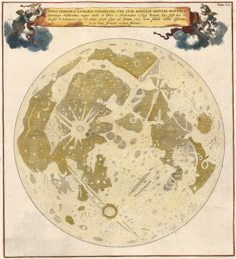 One of the most popular and available 17th-century Moon maps on today’s market is Athanasius Kircher’s Typus Corporis Lunaris Panselini…, first published in his Mundus Subterraneous in 1665. Although the banner above the map credits it to the observations of Christopher Scheiner, it is actually a copy Eustachio Divini’s 1649 lunar map. (Divini is properly credited in Kircher’s text.) Divini was one of the great telescope manufacturers of his era. His Moon map was intended as a testament to the power and quality of his proprietary lenses. It was derived from Hevelius’s Moon, with adjustments based on Divini’s own findings. Kircher’s addition of putti and a banner title to the Divini original was borrowed from Hevelius as well. Divini’s map did nothing to advance selenography, but its appearance in Kircher’s text, which also described the inner workings of the Earth, would have enabled readers in the late 17th century to consider the Moon in a more geological context.
